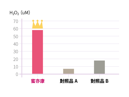 ♠ H2O2產量平盤實驗:蜜亦康和其他對照品相較,黃金秘密六菌產出高達3~7倍的H2O2,對於維持清爽更有效果!